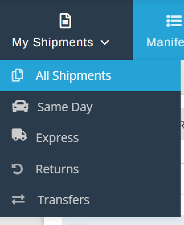 2. From the drop down menu you may choose from various options. All Shipments, Same Day, Express, Returns, Transfers.