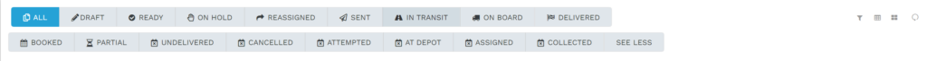 Options include: All, Draft, Ready, On Hold, Reassigned, Sent, In Transit, On Board, Delivered, Booked, Partial, Undelivered, Cancelled, Attempted, At Depot, Assigned, and Collected