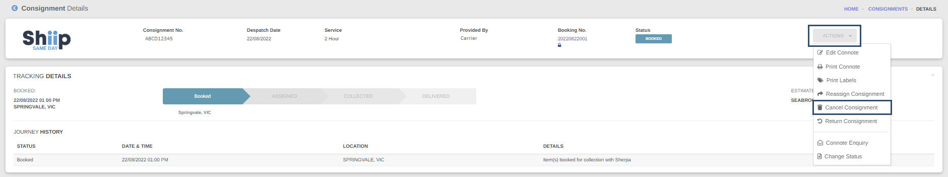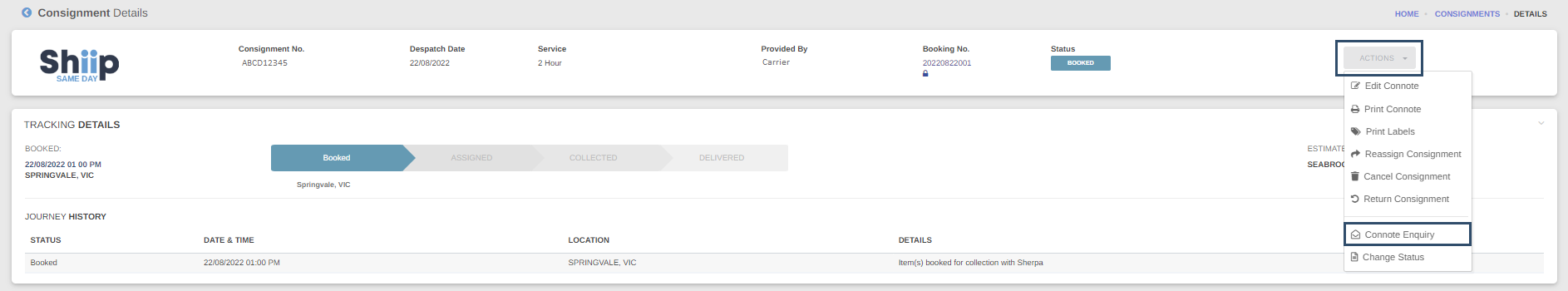 Once you have chosen the consignment, select Actions, then Connote Enquiry.