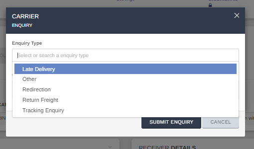This may be Late delivery, Other, Redirection, Return Freight, or Tracking Enquiry.