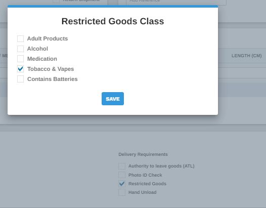 Once you have selected Restricted Goods an additional pop-up will display a range of restricted items. From the list select Tabacco .